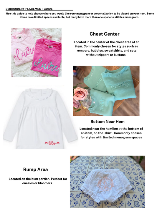 Add a personalized touch to your items with our monogram and embroidery services! For just $15, you can get a beautifully crafted 3.5-inch monogram or embroidery design. We offer a variety of styles and placements—see our attached sheet for more details. Interested in a custom design? Reach out to us at AGrassiTCC@gmail.com with the subject line "Monogram" to get started today!